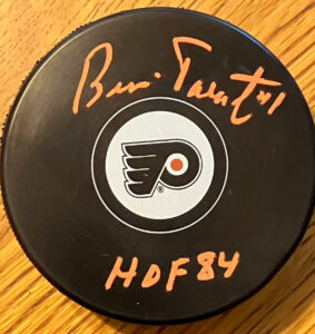 You are purchasing an autographed Philadelphia Flyers Hockey Puck signed by All-Time Great Goalie and NHL Hall of Famer, Bernie Parent. These pucks are signed boldly in orange paint pen and include the inscription “HOF 84” and are PSA authenticated.