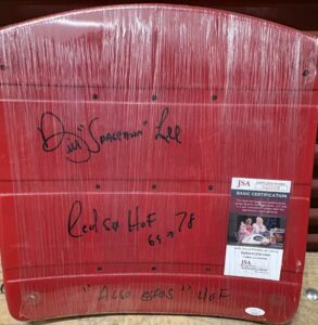 You are purchasing an autographed Fenway Park (Boston Red Sox) stadium seat bottom signed by their former pitcher Bill “Spaceman” Lee. This item includes the inscriptions: “Red Sox HOF”, “69-78” and “Also Expos HOF” and is JSA authenticated. NOTE: The glare in the photos is from plastic wrapping used to protect the signature.