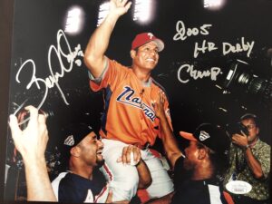 You are purchasing an autographed 8×10 photo signed by Philadelphia Phillies OF Bobby Abreu. This photo was taken just after he won the 2005 Homerun Derby and it includes the inscription “2005 HR Derby Champ”. This item is also JSA authenticated.