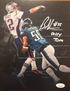 You are purchasing an autographed 8×10 Philadelphia Eagles photo of former LB, fan favorite and 2x Super Bowl Champion LB, Brandon Graham. This item includes the inscription “Sorry Tom” and is JSA authenticated.