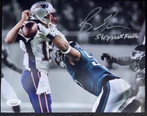 You are purchasing an autographed 8×10 Philadelphia Eagles photo signed by former LB, fan favorite and 2x Super Bowl Champion Brandon Graham. This photo includes the inscription “Strip Sack Fumble” and is JSA authenticated.