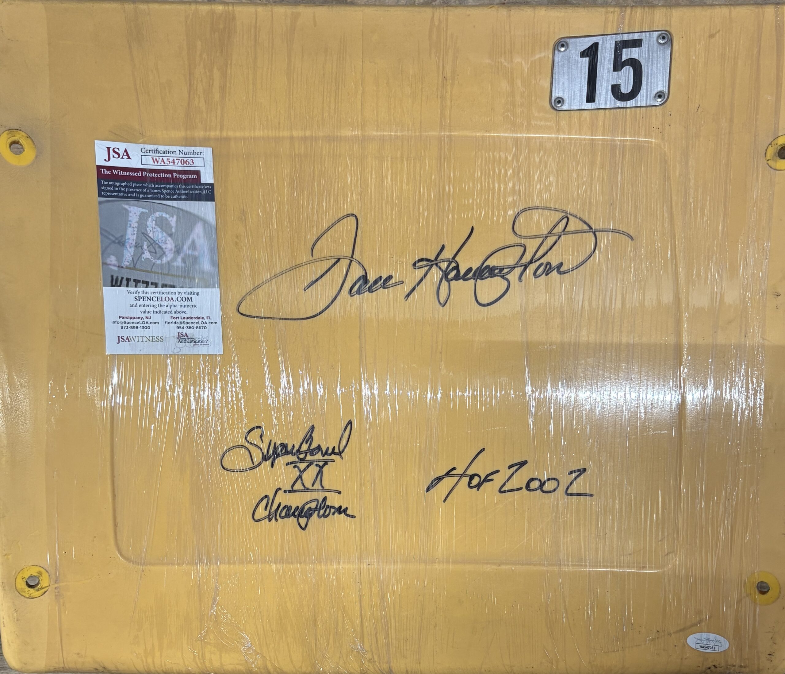 You are purchasing an autographed Soldier Field (Chicago Bears) stadium seat back signed by Super Bowl Champion and Hall of Famer, Dan Hampton. This item includes the inscriptions: “Super Bowl XX Champion” and “HOF 2002” and is JSA authenticated. NOTE: The glare in the photos is from plastic wrapping used to protect the signature.