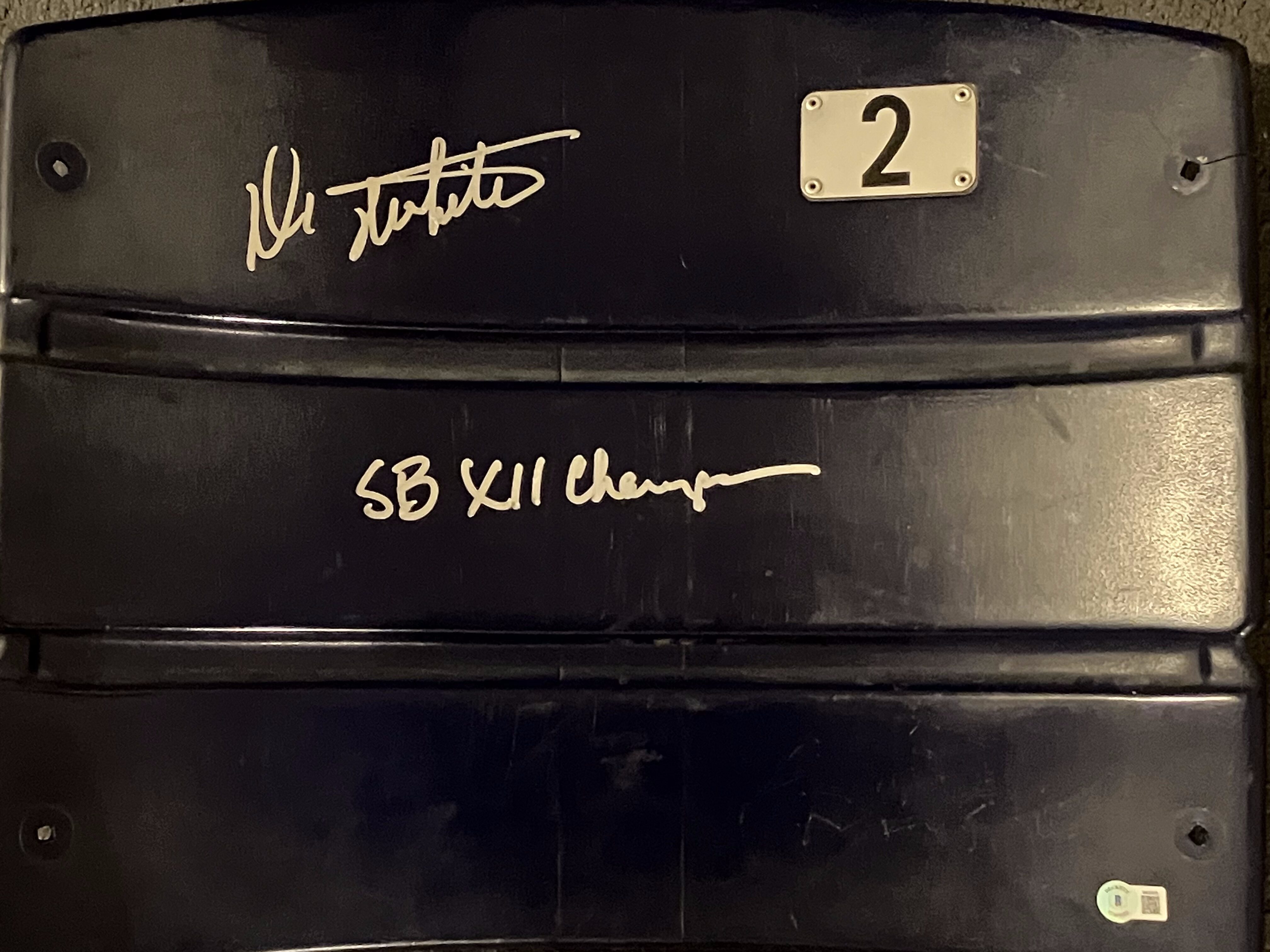 You are purchasing an autographed Texas Stadium (Dallas Cowboys) seat back signed by former Super Bowl Champion and Cowboys QB/P, Danny White. This item includes the inscription “SB XII Champs” and is Beckett authenticated.
