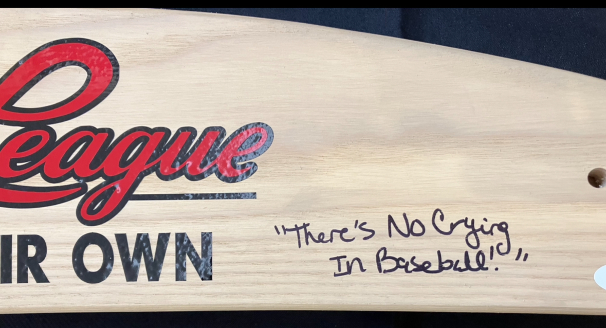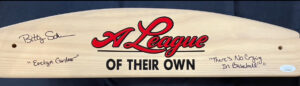 You are purchasing an autographed “A League of Their Own” custom wooden seat panel signed by Elizabeth “Bitty” Schram who played Evelyn Gardner in the hit movie. This item includes the inscriptions: “Evelyn Gardner” which was her character name and the most popular line in the movie “There’s No Crying In Baseball”. This item is JSA Authenticated.