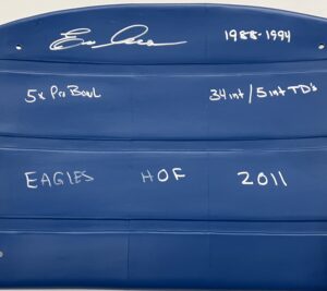 You are purchasing an autographed Veterans Stadium (Philadelphia Eagles) Stat seat bottom signed by the recent NFL Hall of Fame Inductee, Eric Allen. This item includes the following (4) inscriptions: “1988-1994”, “5x Pro Bowl”, “34 int/5 int TD’s” and “Eagles HOF 2011”. These stats are from his playing time with the Philadelphia Eagles only! This item is PSA authenticated.