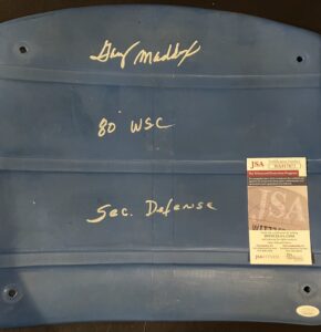 You are purchasing an autographed Veterans Stadium (Philadelphia Phillies) seat bottom signed by their former CF and 1980 World Series Champion, Garry Maddox. This item includes the inscriptions ” 80 WSC” and “Sec Defense” as he was known as the Secretary of Defense. This item is JSA authenticated.