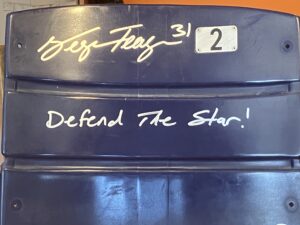 You are purchasing an autographed Texas Stadium (Dallas Cowboys) seat back signed by their former DB, George Teague. Teague took offense when Terrell Owens (49ers) spiked the football on the Cowboys Star at midfield and took matters into his own hands. This item includes the inscription “Defend The Star!” and is JSA authenticated.