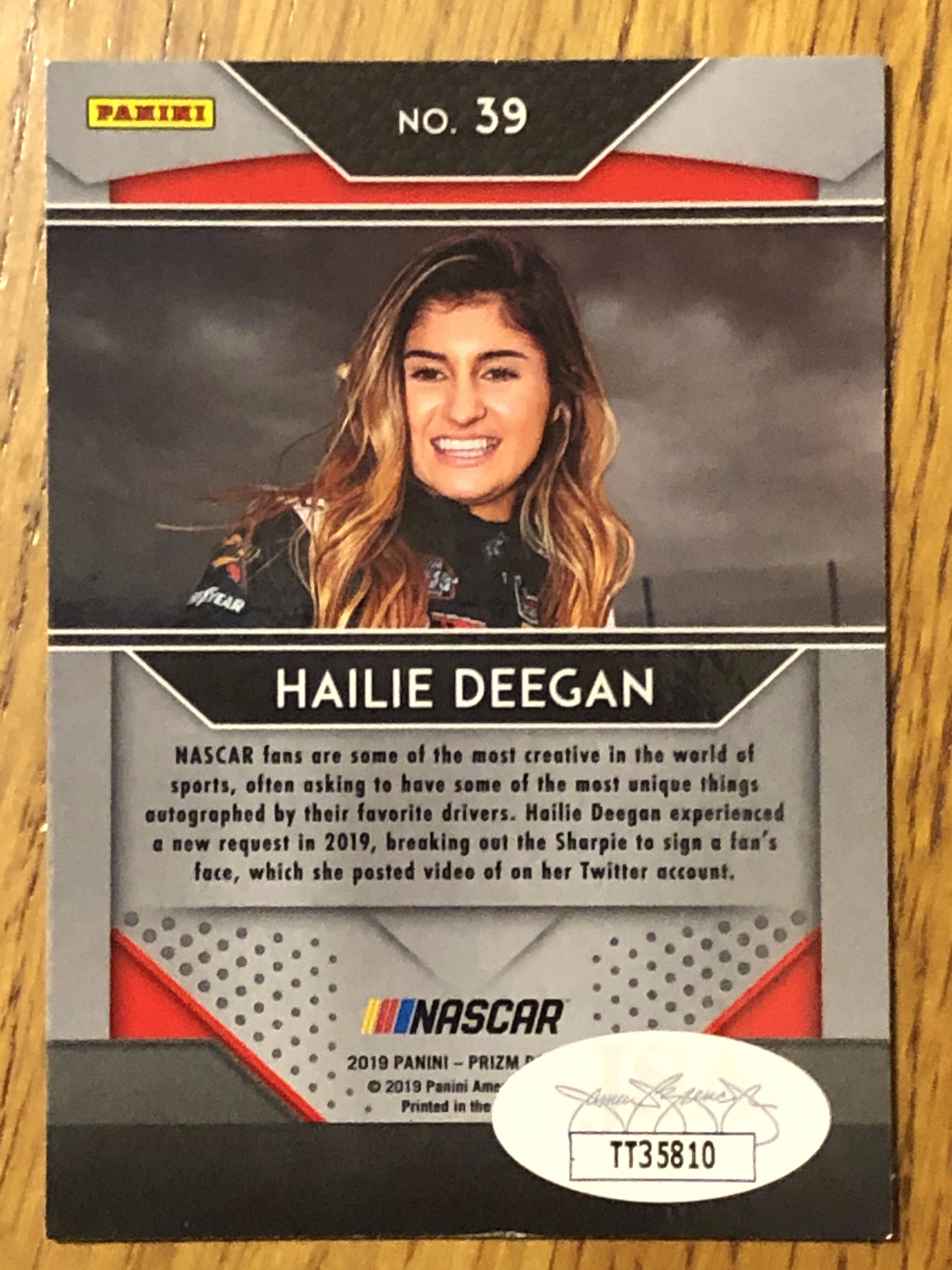 You are purchasing an autographed 2019 Panini Prizm Racing Trading Card signed by driver Hailie Deegan. This item is JSA authenticated. The item you receive is the exact item shown.