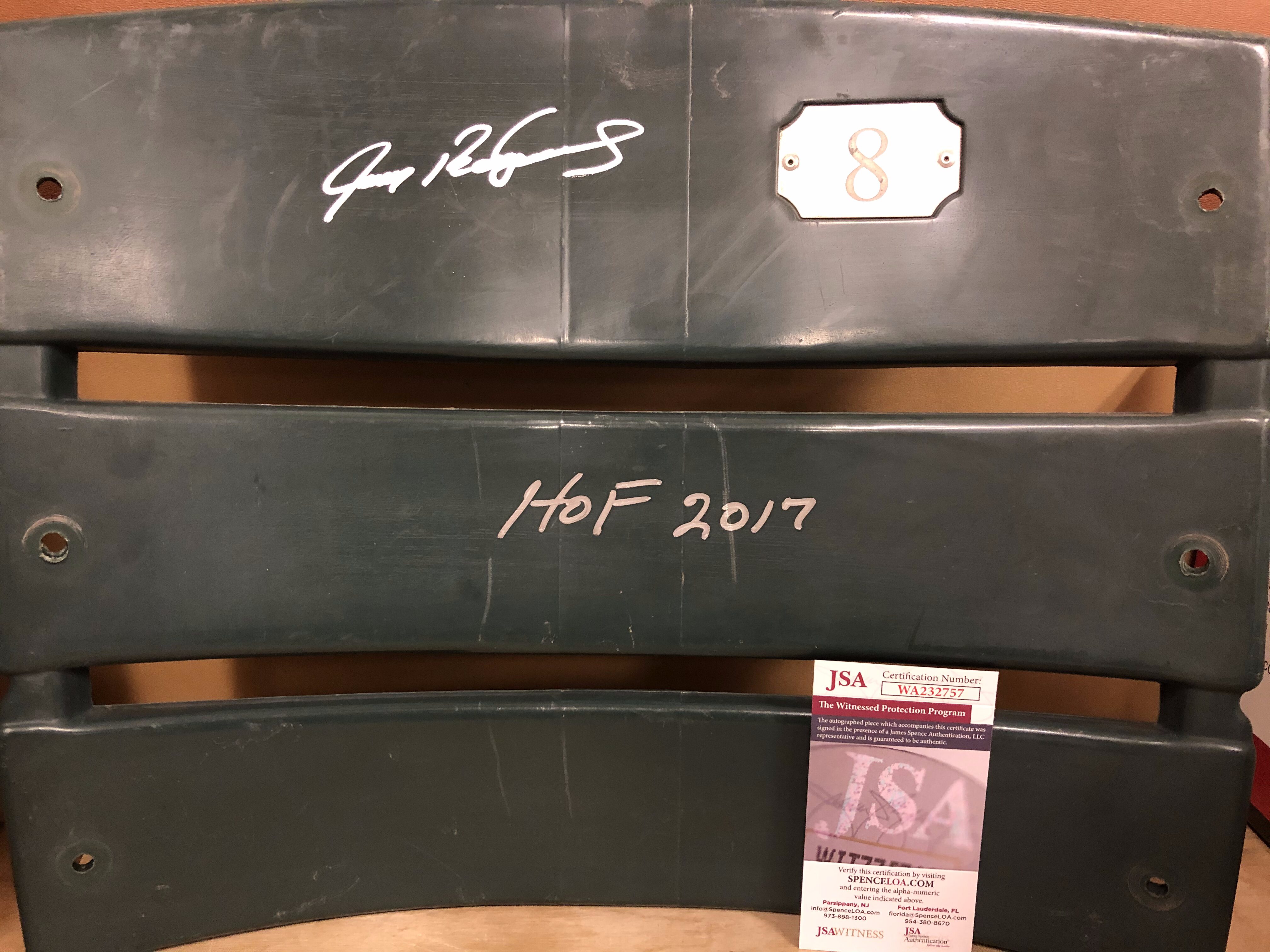 You are purchasing an autographed Ivan Rodriguez Ballpark at Arlington (Texas Rangers) stadium seat back. This item includes the inscription “HOF 2017” and is JSA authenticated.