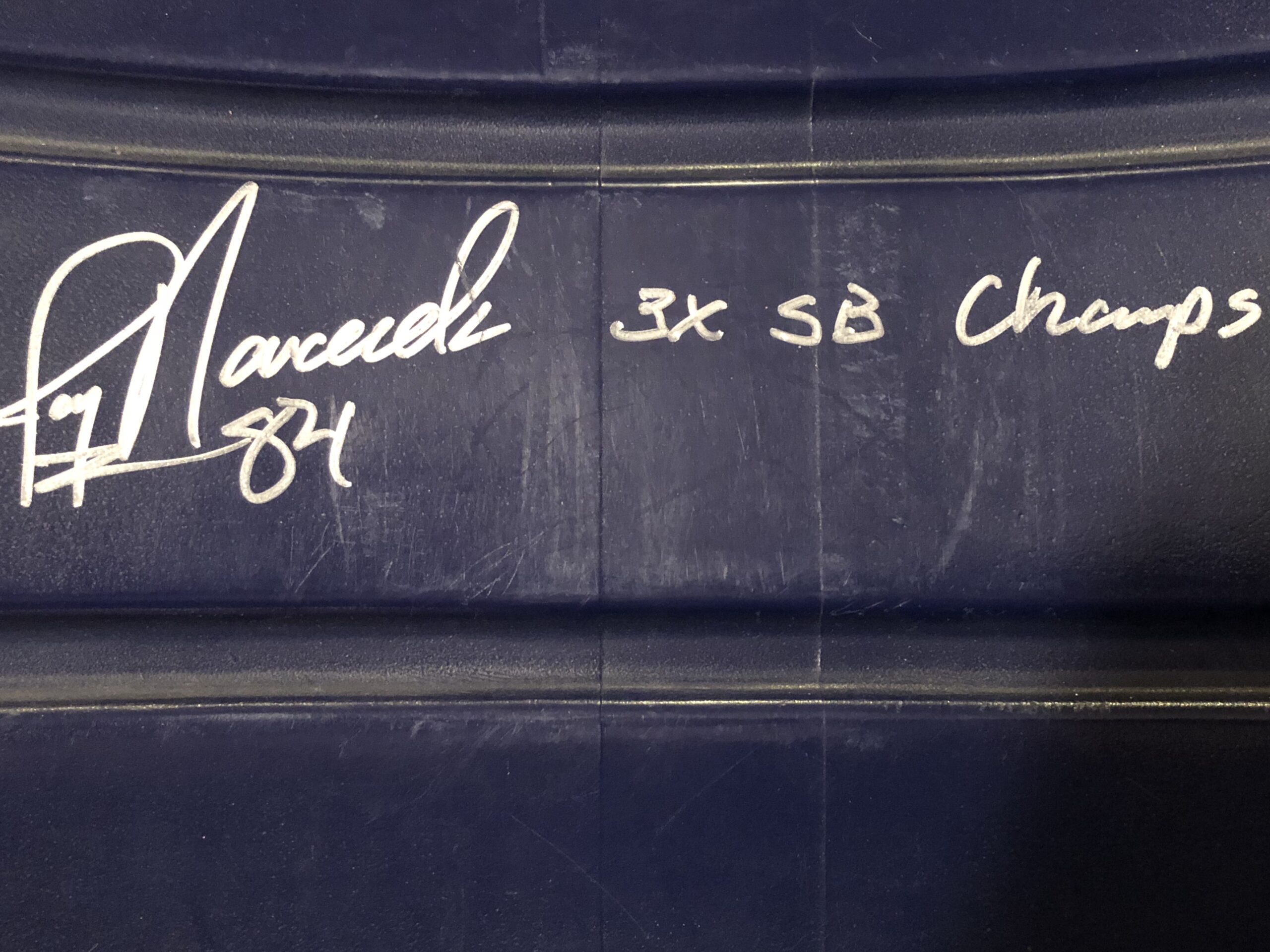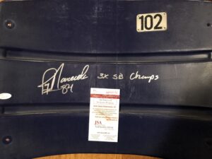 You are purchasing an autographed Texas Stadium (Dallas Cowboys) seat back signed by 3x Super Bowl Champion TE, Jay Novacek. This item includes the inscription “3x SB Champs” and is JSA authenticated.