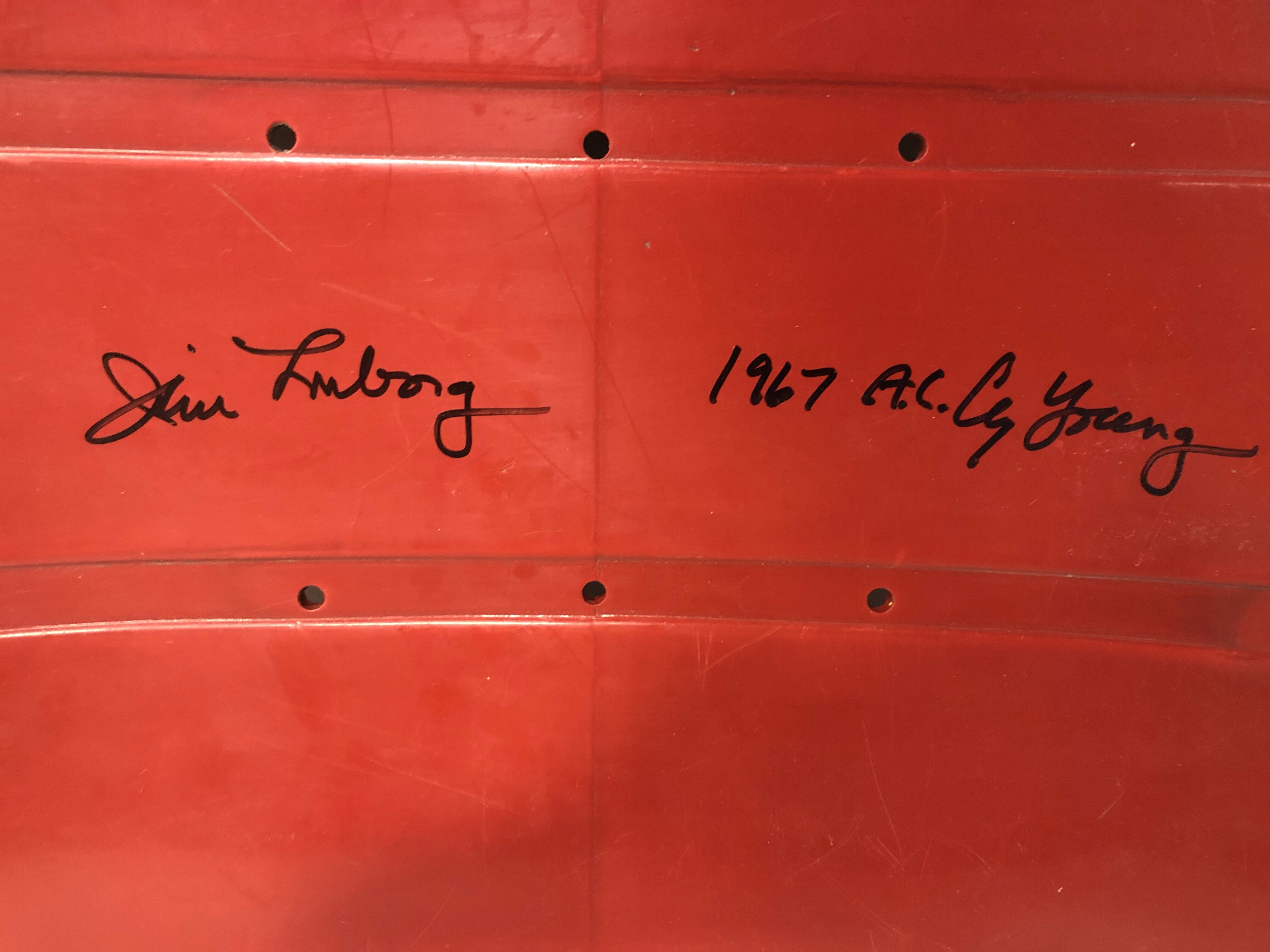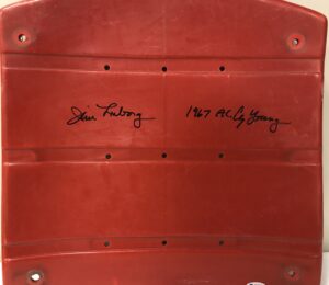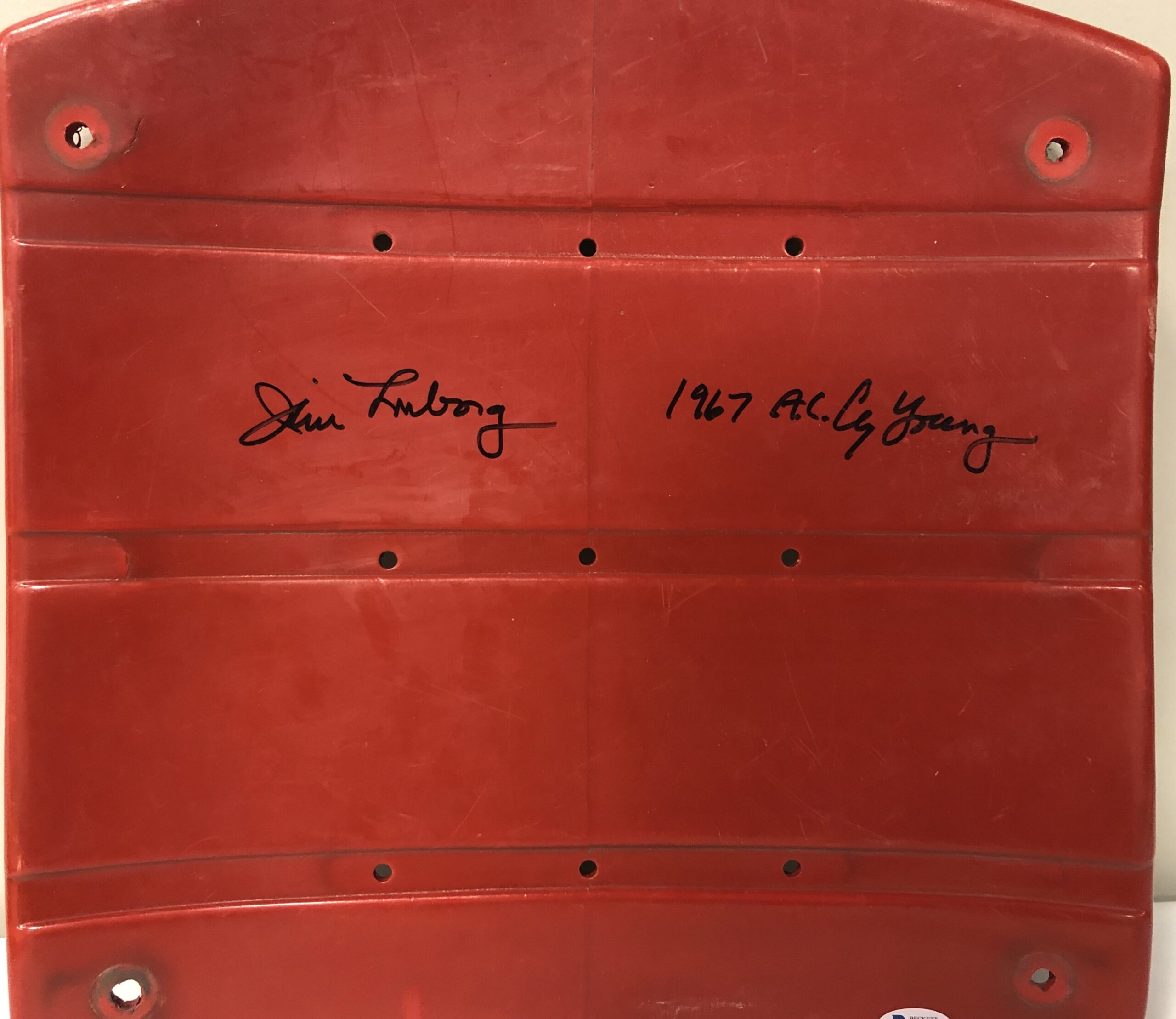 You are purchasing an autographed Fenway Park (Boston Red Sox) seat bottom signed by former pitcher, Jim Lonborg. This item includes the inscription “1967 AL Cy Young” and is Beckett authenticated.