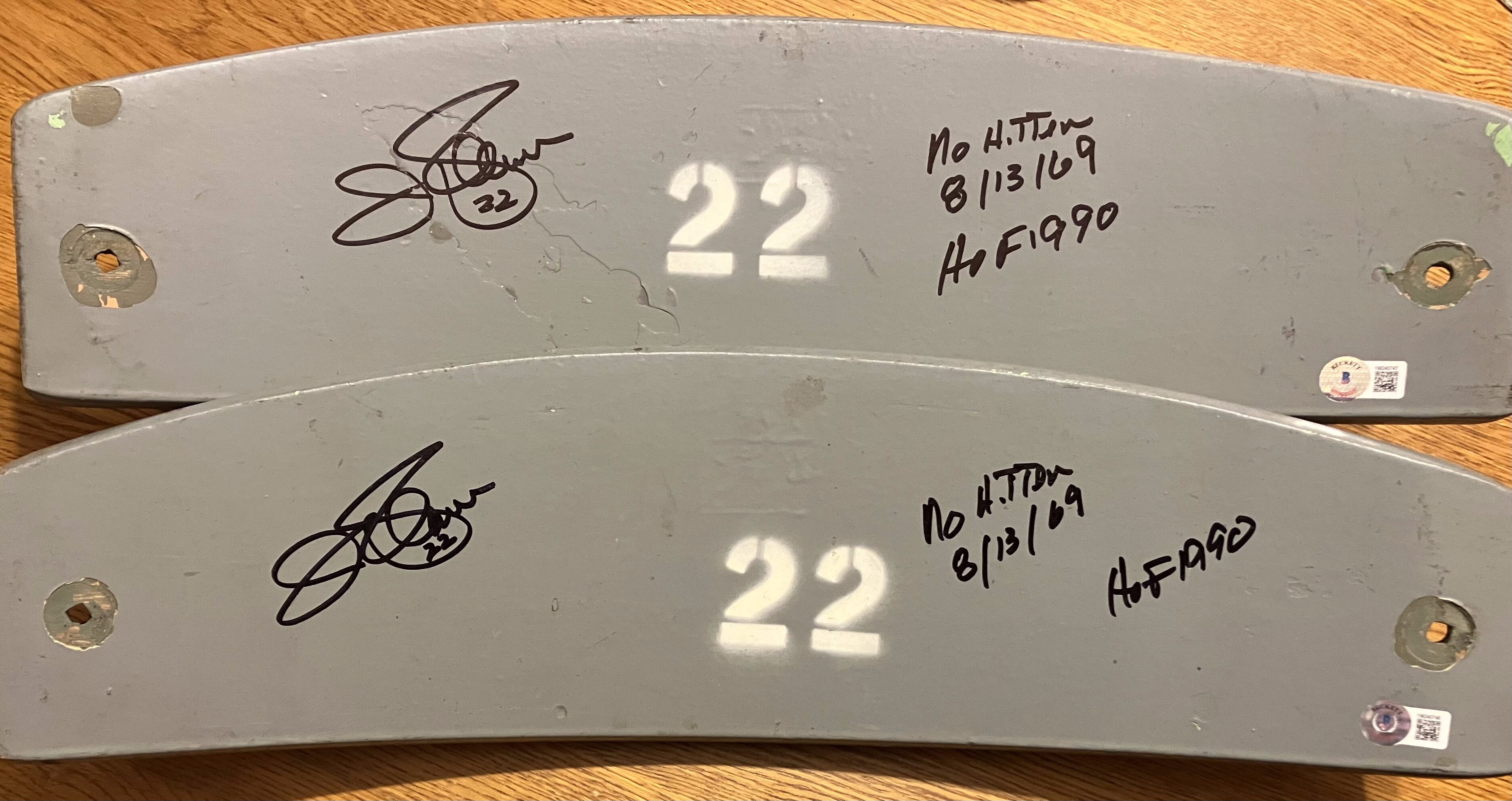 You are purchasing an autographed Memorial Stadium (Baltimore Orioles) #22 wooden seat panel signed by Hall of Fame pitcher Jim Palmer. The #22 top wooden seat panel is significant as it was Palmer’s uniform number for the Baltimore Orioles. This item includes the inscriptions: “No Hitter 8/13/69” and “HOF 1990” and is Beckett authenticated.