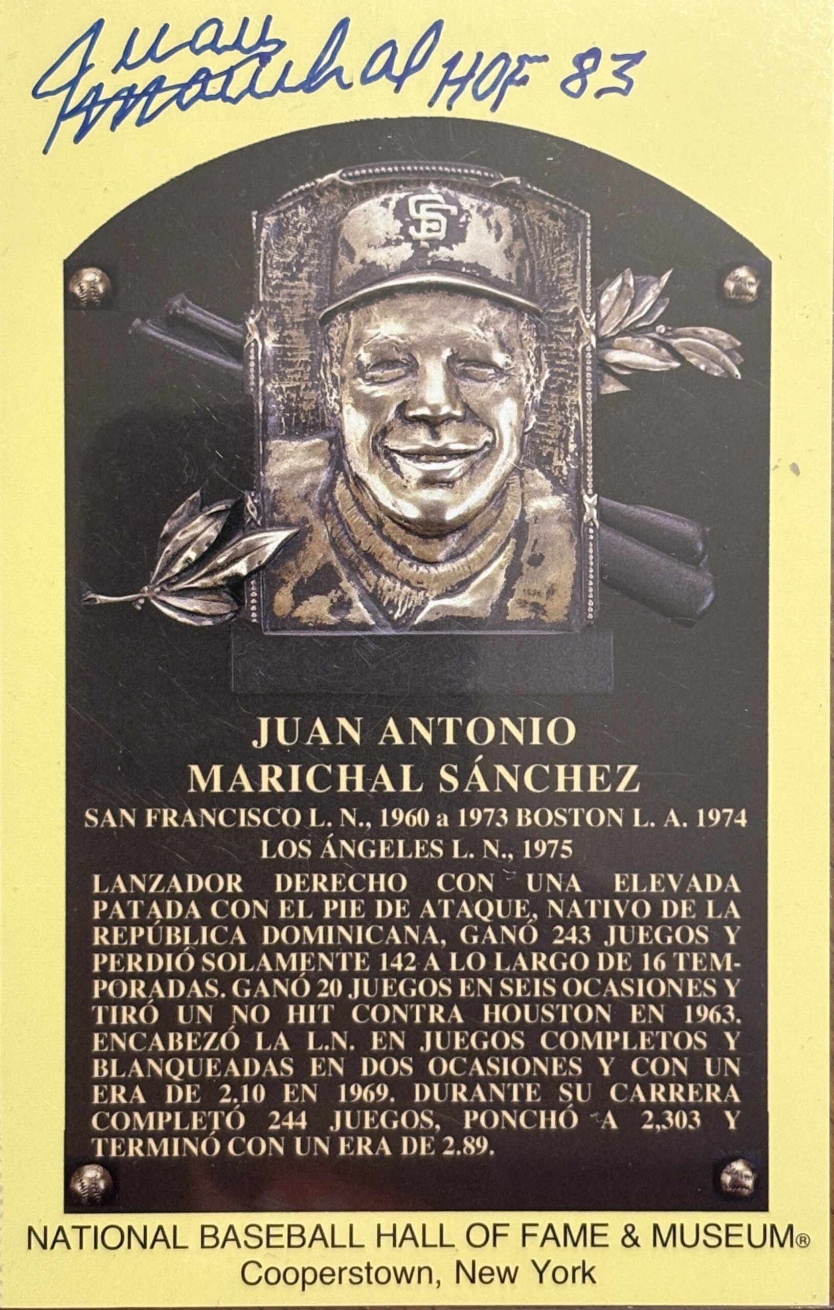 You are purchasing an autographed Hall of Fame Postcard signed by Hall of Fame pitcher Juan Marichal. This postcard is the Spanish version of the Hall of Fame postcard, includes the inscription “HOF 83” and is JSA authenticated.
