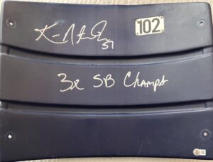 You are purchasing an autographed Texas Stadium (Dallas Cowboys) seat back signed by LB Ken Norton Jr. This item includes the inscription “3x SB Champs” and is Beckett Authenticated.