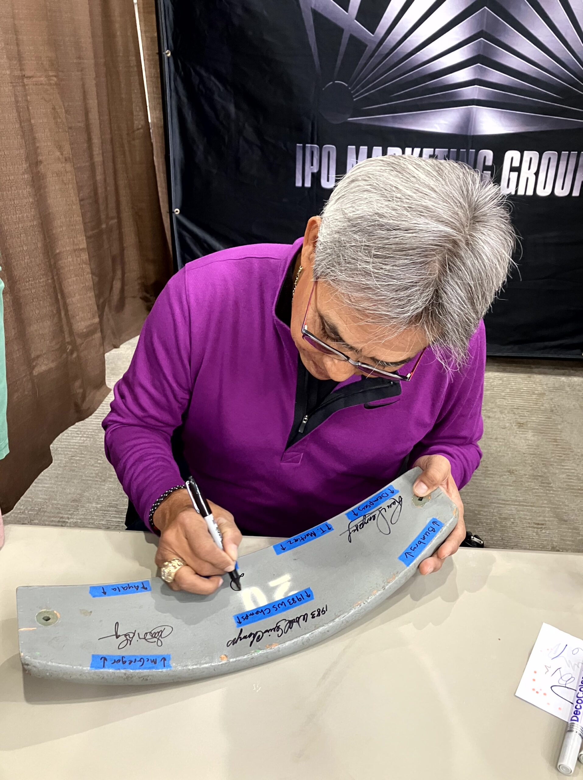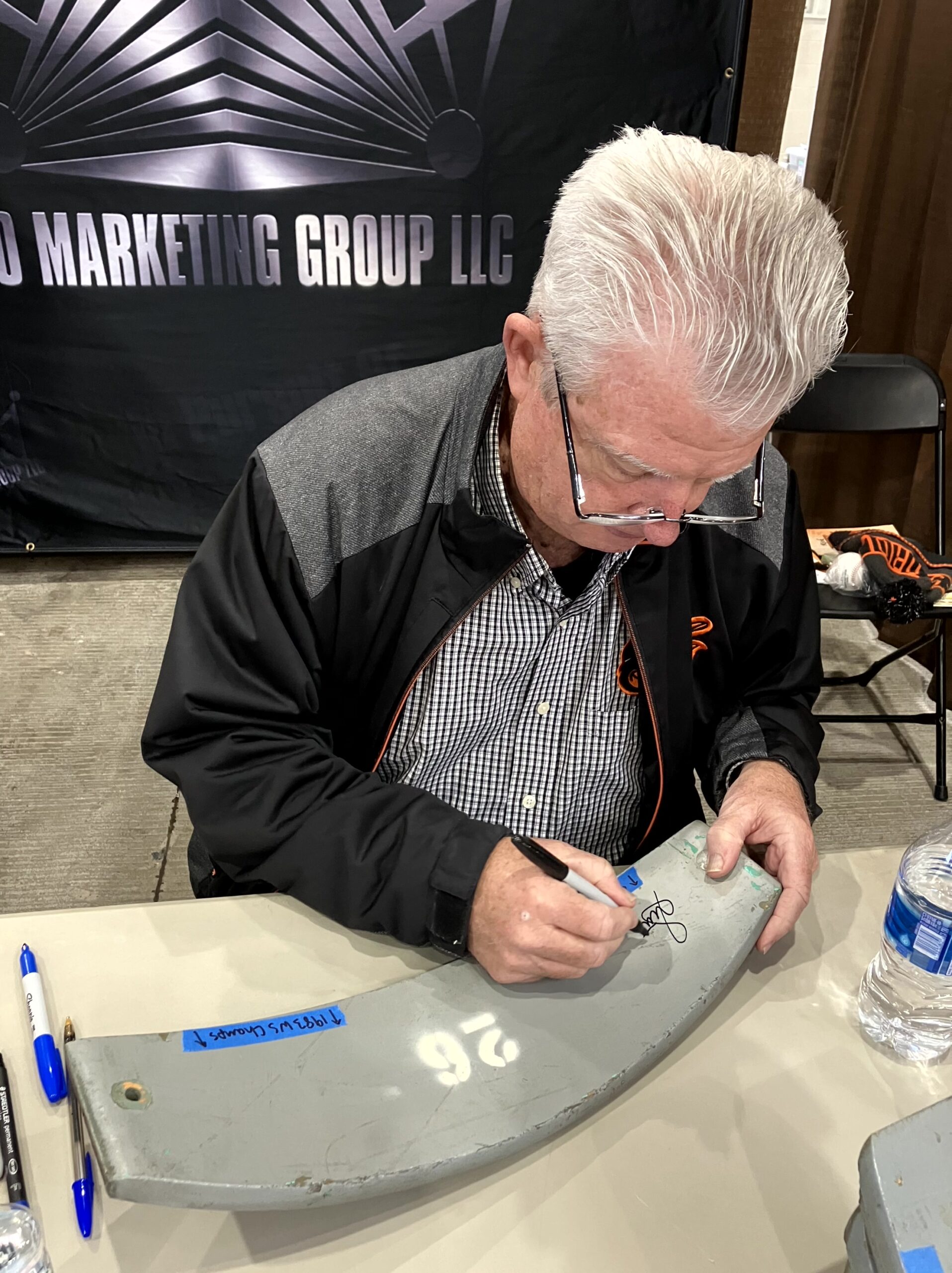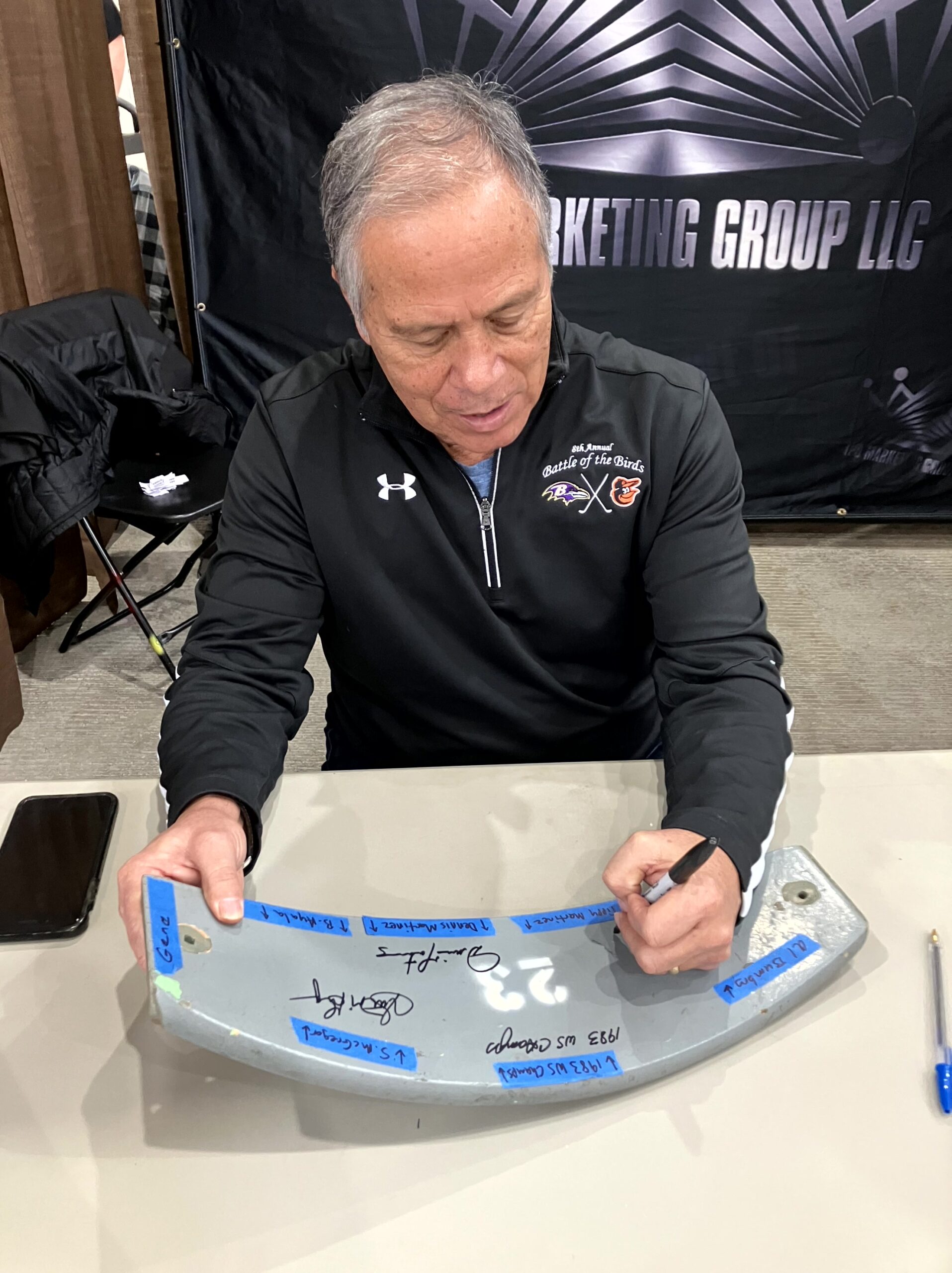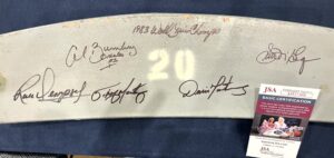 You are purchasing an autographed Memorial Stadium (Baltimore Orioles) wooden seat panel signed by five of the members of their 1983 World Series Championship Team. This item was signed by: Rick Dempsey, Al Bumbry Scott McGregor, Tippy Martinez and Dennis Martinez. This item includes the inscription “1983 World Series Champs” and is JSA authenticated.