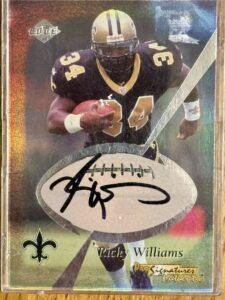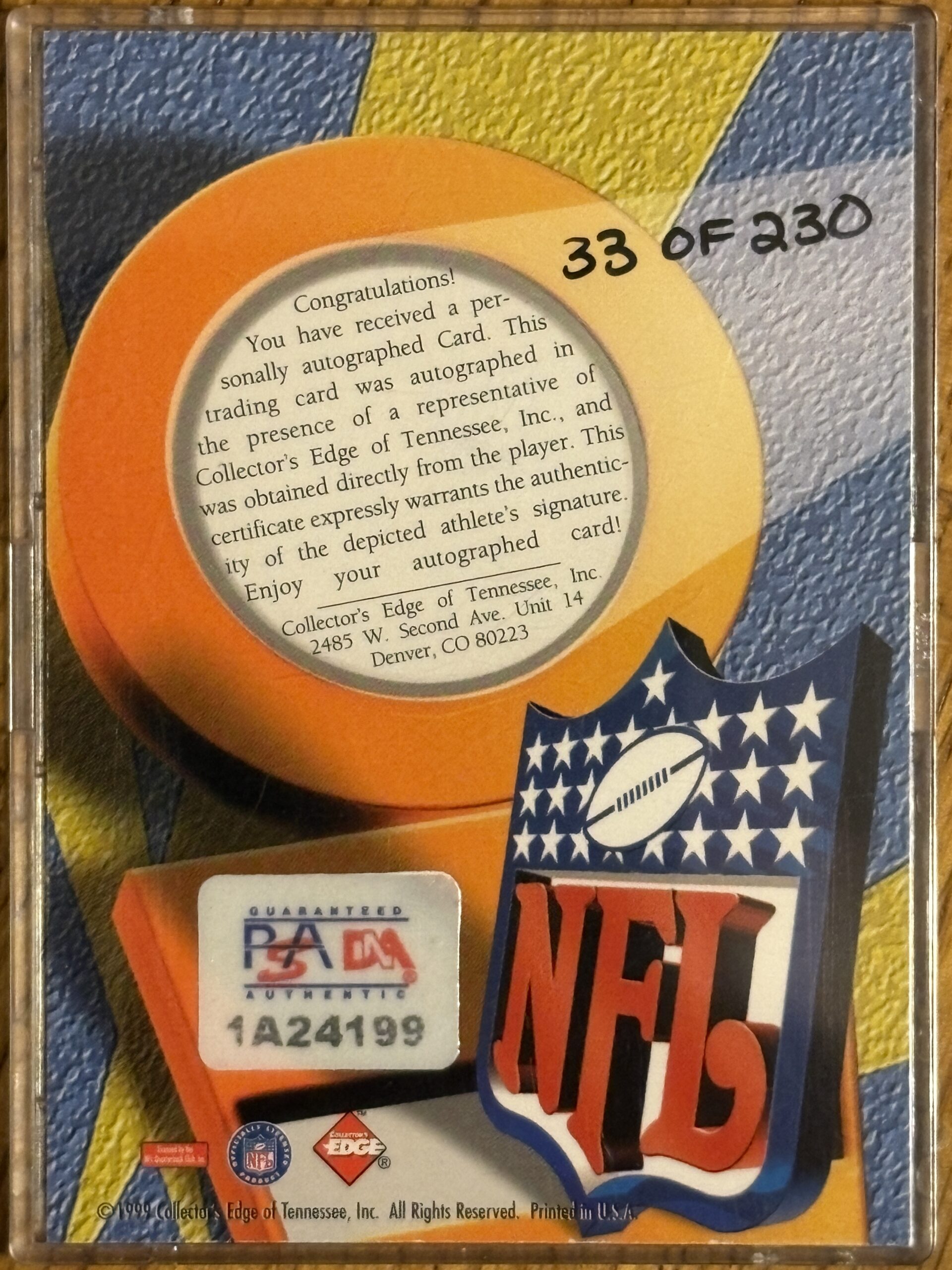 You are purchasing an autographed 1999 Collector’s Edge Pro Signatures Football Card signed by former RB, Ricky Williams. This card is numbered 33/230 and also includes PSA authentication on back of the card.
