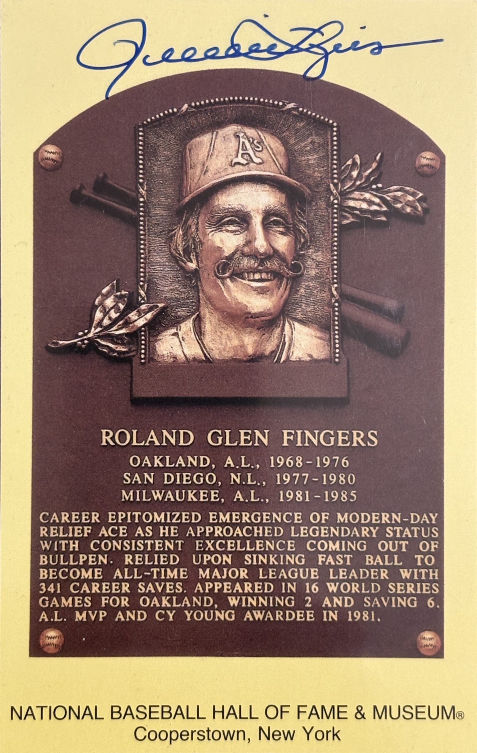 You are purchasing an autographed Hall of Fame Postcard signed by Hall of Fame pitcher Rollie Fingers. This item is JSA authenticated.