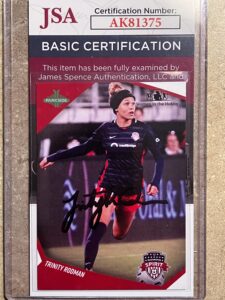 You are purchasing an autographed 2022 Parkside NWSL trading card signed by Soccer Star Trinity Rodman. This item is JSA authenticated.