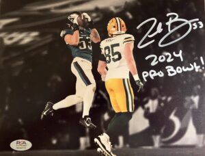 You are purchasing an autographed 8×10 photo signed by Philadelphia Eagles Pro Bowl LB, Zack Baun. This photo is from his interception in the NFC Wildcard game vs the Green Bay Packers. This item includes the inscription “2024 Pro Bowl” and is PSA authenticated.